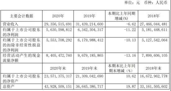 公告披露顯示經(jīng)董事會審議的報告期利潤分配預(yù)案或公積金轉(zhuǎn)增股本預(yù)案:2020年度,母公司實現(xiàn)凈利潤為3,155,313,737元,合并后歸屬于母公司股東的凈利潤為5,630,598,812元。截止2020年12月31日母公司可供分配利潤為7,370,600,800元。