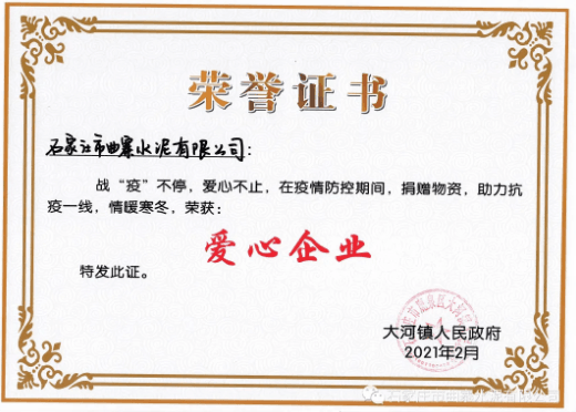 疫情無(wú)情,人間有愛(ài),為弘揚(yáng)正能量,充分發(fā)揮先進(jìn)典型作用,2021年3月25日,大河鎮(zhèn)人民政府舉辦2020年抗擊疫情表彰會(huì)。石家莊市曲寨水泥獲得“抗疫愛(ài)心企業(yè)”稱(chēng)號(hào)。
