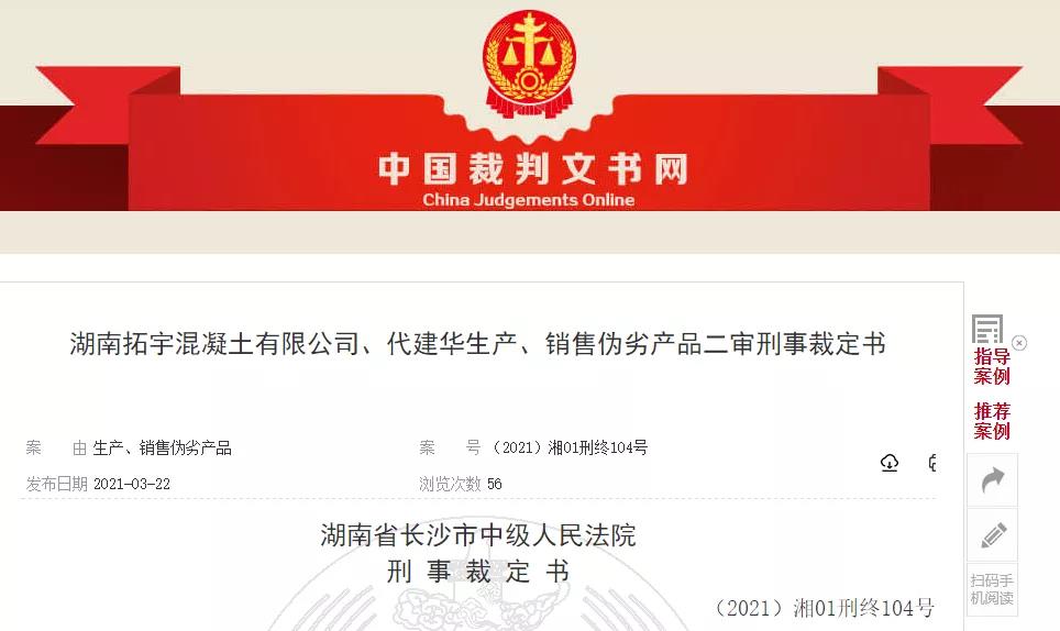 日前,湖南省長沙市中級人民法院對“湖南拓宇混凝土有限公司、代建華生產(chǎn)、銷售偽劣產(chǎn)品”案件作出二審刑事裁定。