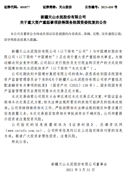 公司近期收到中國(guó)建材的通知,獲悉其收到國(guó)務(wù)院國(guó)資委下發(fā)的《關(guān)于新疆天山水泥股份有限公司資產(chǎn)重組及配套融資有關(guān)事項(xiàng)的批復(fù)》,國(guó)務(wù)院國(guó)資委原則同意本次交易正式方案。