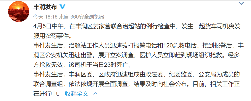 6日晚間,@豐潤(rùn)發(fā)布通報(bào)稱,4月5日中午,在豐潤(rùn)區(qū)姜家營(yíng)聯(lián)合治超站的例行檢查中,發(fā)生一起貨車司機(jī)突發(fā)服用農(nóng)藥事件。