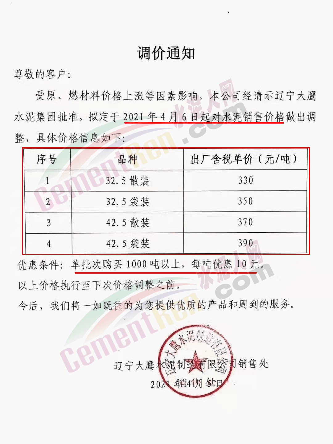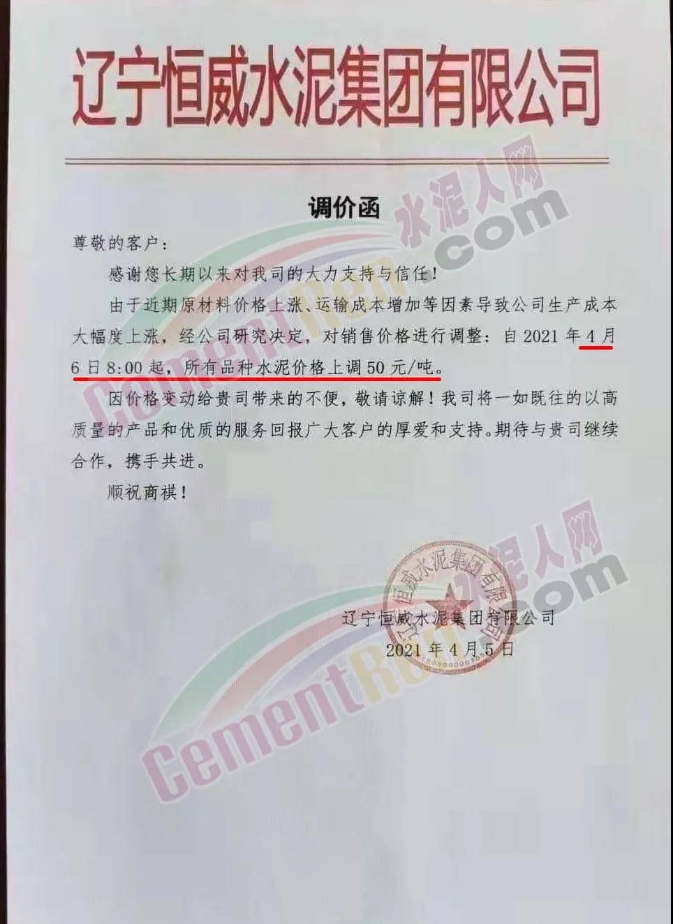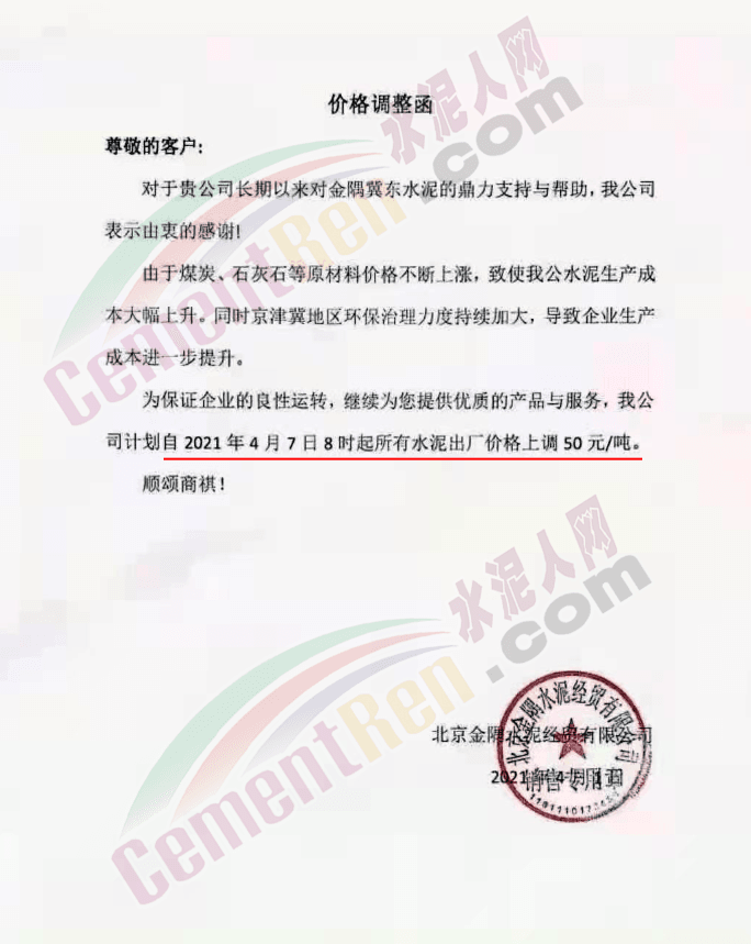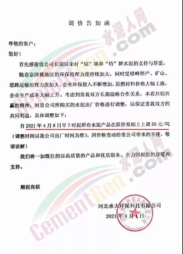 河北承大環(huán)??萍加邢薰菊{(diào)價告知函稱,隨著京津冀地區(qū)的環(huán)保治理力度持續(xù)加大,同時受錯峰停產(chǎn)、礦山、道路運輸治理力度加大、企業(yè)環(huán)保投入不斷增加,原燃材料價格大幅上漲,企業(yè)生產(chǎn)成本大幅上升。自 2021年4 月8日早7時起所有水泥產(chǎn)品在原價基礎(chǔ)上上調(diào) 50 元/噸。