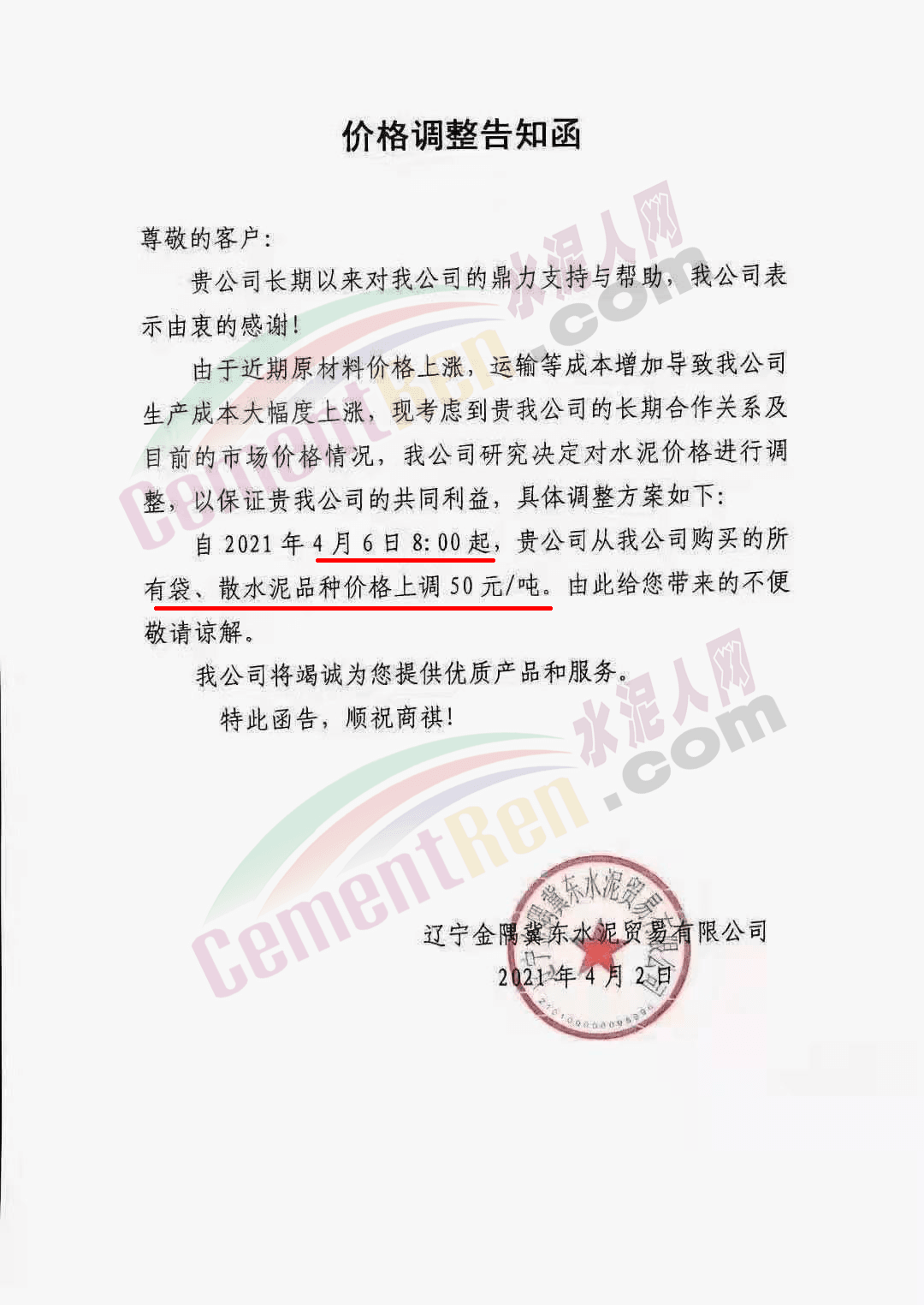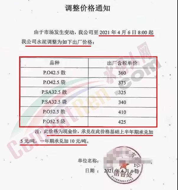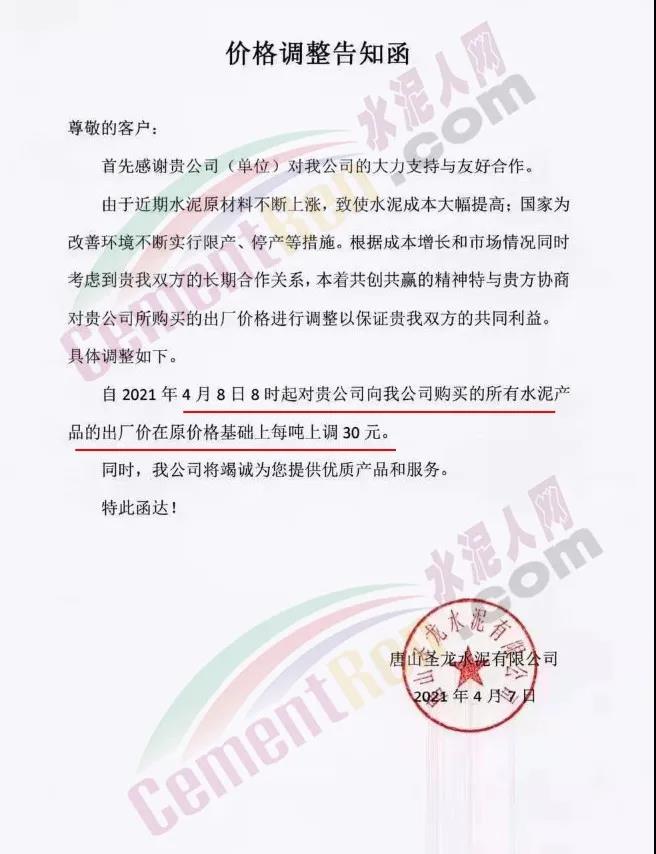 唐山圣龍水泥有限公司通知,由于近期水泥原材料不斷上漲,致使水泥成本大幅提高,自 4月8日8時所有水泥產(chǎn)品的出廠價在原價格基礎(chǔ)上上調(diào)30元/噸。