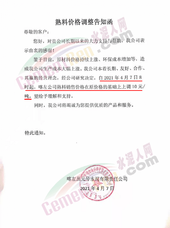 遼寧喀左叢元號水泥熟料價格調(diào)整告知函稱,鑒于目前,原材料價格持續(xù)上漲、環(huán)保成本增加等,造成公司生產(chǎn)成本大幅上漲。自4月7日8時起,喀左公司熟料銷售價格在原價格的基礎(chǔ)上上調(diào)10 元/噸。