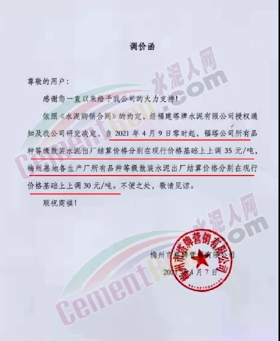 福州市塔牌營銷公司通知自4 月9日零時起,福塔公司所有品種等級散裝水泥出廠結(jié)算價格分別在現(xiàn)行價格基礎(chǔ)上上調(diào) 35 元/噸,梅州基地各生產(chǎn)廠所有品種等級散裝水泥出廠結(jié)算價格分別在現(xiàn)行價格基礎(chǔ)上上調(diào) 30 元/噸。據(jù)水泥人網(wǎng)通訊反饋近期該企業(yè)已連續(xù)多次上調(diào)水泥價格,累計漲幅近100元/噸。