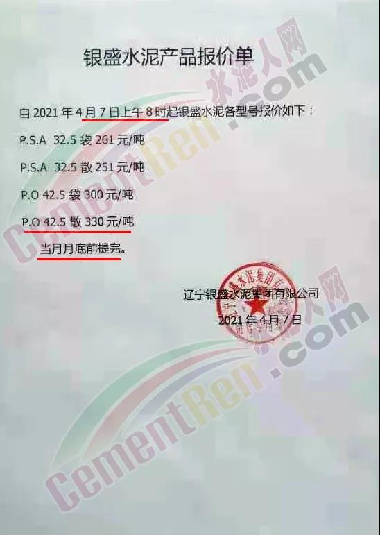 遼寧銀盛通知自4月7日上午8時起各型號執(zhí)行最新報告,其中P.O42.5散裝水泥報價330元/噸。且要求當(dāng)月月底前提完。據(jù)水泥人網(wǎng)通訊員反饋,當(dāng)日銀盛水泥廠門前出現(xiàn)了水泥車排隊提貨現(xiàn)象。