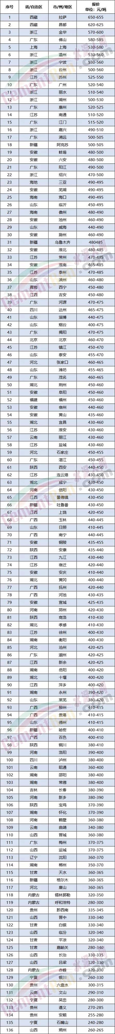從水泥人網(wǎng)重點監(jiān)控的100多個區(qū)域報價來看各區(qū)域均價約在418.65~442.72元/噸之間,在400~500元/噸價格區(qū)間的區(qū)域約占60%以上。最高價仍在西藏高原地區(qū),昌都區(qū)域PO42.5散裝水泥報價達(dá)到620-625元/噸,處于第二位的是長三角區(qū)域和珠三角區(qū)域,浙江金華報價已超600元/噸,廣東佛山目前報價與600元/噸也只差一張20元/噸的“漲價函”。從目前的行情趨勢來看,達(dá)到600元/噸也是指日可待。