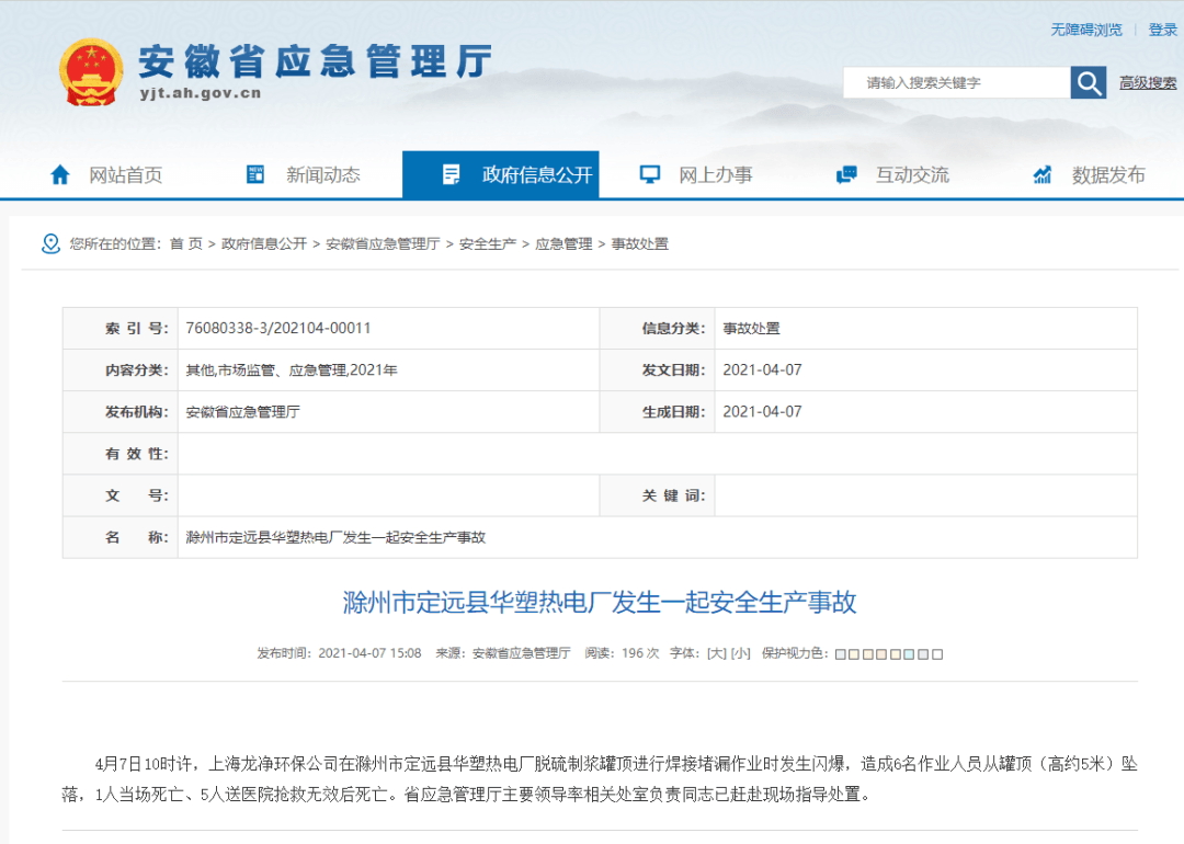 據(jù)安徽省應急管理廳官網通報,4月7日10時許,上海龍凈環(huán)保公司在滁州市定遠縣華塑熱電廠脫硫制漿罐頂進行焊接堵漏作業(yè)時發(fā)生閃爆,造成6名作業(yè)人員從罐頂(高約5米)墜落,1人當場死亡、5人送醫(yī)院搶救無效后死亡。省應急管理廳主要領導率相關處室負責同志已趕赴現(xiàn)場指導處置。