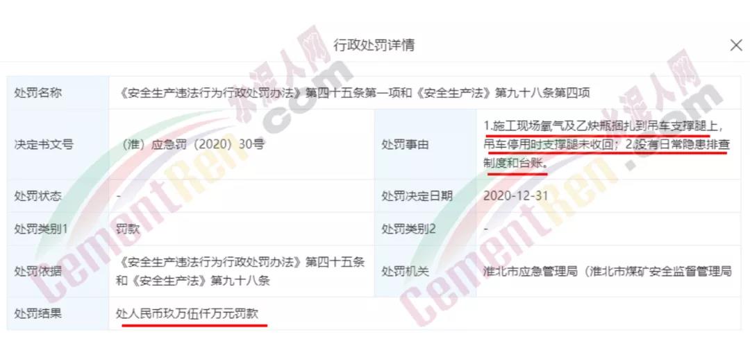 處罰日期:2020年12月31日;處罰結果:處人民幣玖萬伍仟萬元罰款;處罰事由:1.施工現(xiàn)場氧氣及乙炔瓶捆扎到吊車支撐腿上,吊車停用時支撐腿未收回;2.沒有日常隱患排查制度和臺賬。