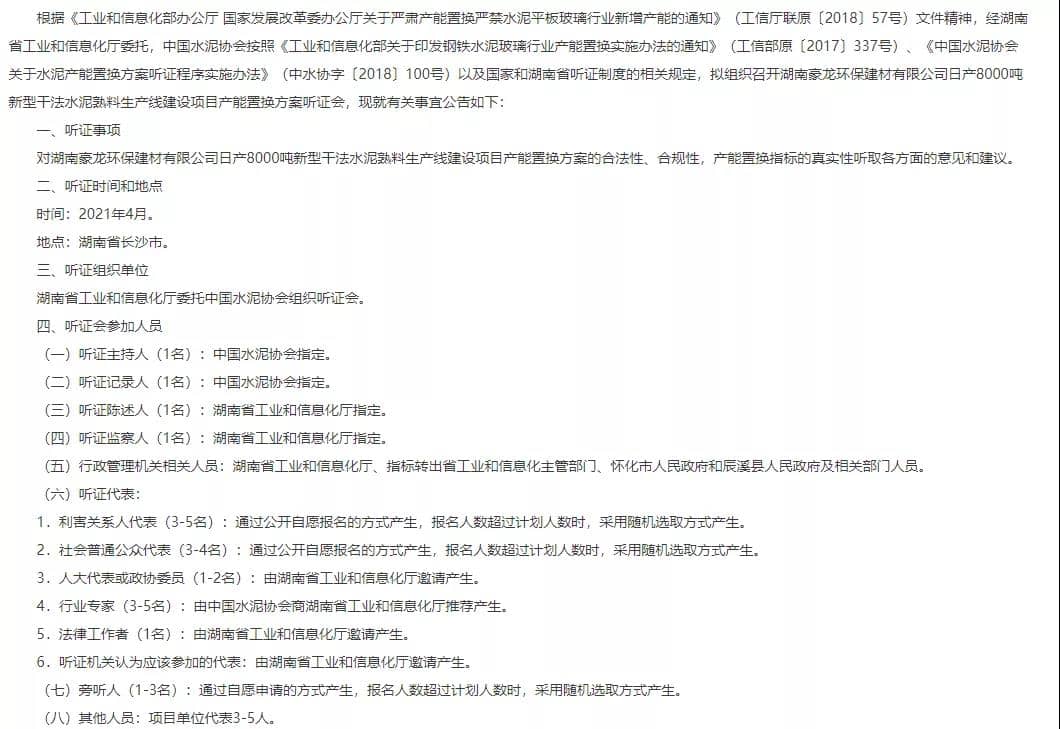 日前湖南省工信廳發(fā)布《關(guān)于組織召開湖南豪龍環(huán)保建材有限公司日產(chǎn)8000噸新型干法水泥熟料生產(chǎn)線建設(shè)項目產(chǎn)能置換方案聽證會的公告》稱,依據(jù)相關(guān)文件規(guī)定,擬組織召開湖南豪龍環(huán)保建材有限公司日產(chǎn)8000噸新型干法水泥熟料生產(chǎn)線建設(shè)項目產(chǎn)能置換方案聽證會。聽證時間,2021年4月,地點湖南省長沙市。詳情如下:
