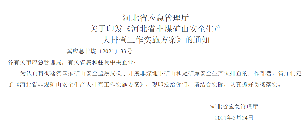 特別是要聚焦當(dāng)前突出問題和重點工作,按照《河北省應(yīng)急管理廳關(guān)于貫徹落實全國礦山安全生產(chǎn)視頻會議精神進一步加強當(dāng)前非煤礦山安全生產(chǎn)工作的緊急通知》(冀應(yīng)急非煤〔2021〕20號)要求,