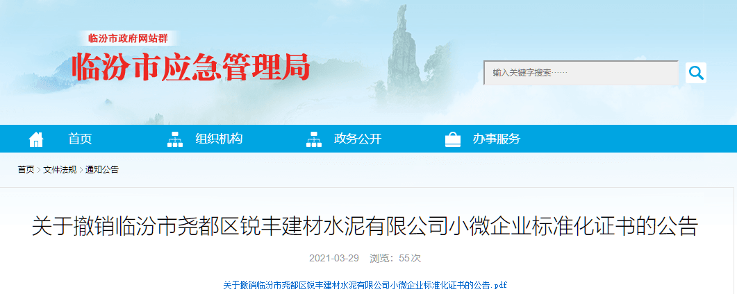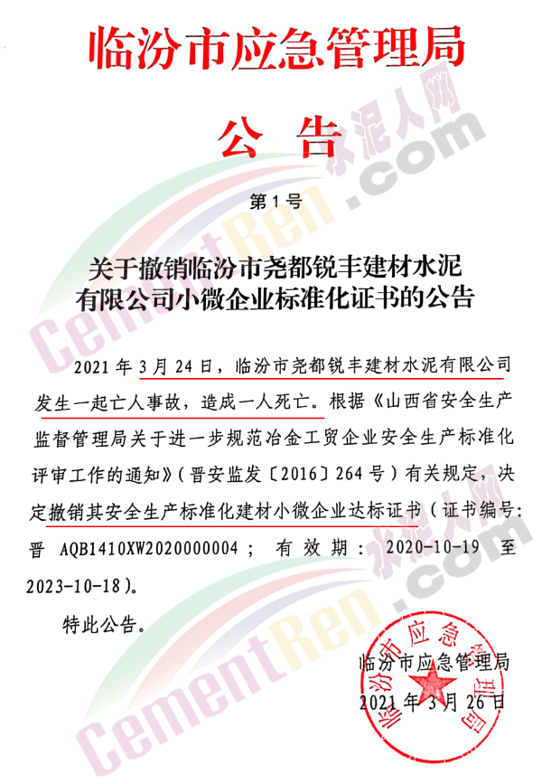 日前,山西臨汾市應(yīng)急管理局發(fā)布公告稱,2021年 3月 24日,臨汾市堯都銳豐建材水泥有限公司發(fā)生一起亡人事故,造成一人死亡。