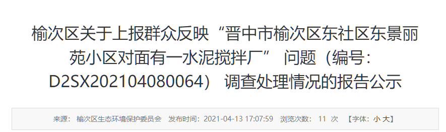 2021年4月8日,收到群眾反映的(編號(hào):D2SX202104080064)環(huán)境問(wèn)題,榆次區(qū)高度重視,立即安排晉中市生態(tài)環(huán)境局榆次分局進(jìn)行調(diào)查。經(jīng)查,反映情況屬實(shí),現(xiàn)將有關(guān)情況報(bào)告如下: