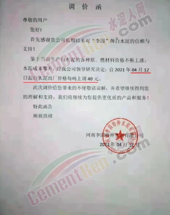 14日下午,禹州、滎陽、衛(wèi)輝主要品牌企業(yè)通知水泥價格上調50元/噸后,新安中聯通知上調水泥價格50元/噸;孟 電水泥通知PO42.5、PO52.5、PC42.5等標號水泥水泥上調50元/噸 ;新鄉(xiāng)縣敦留店水泥有限公司通知高標42.5散裝水泥價格每噸上調20元/噸 。