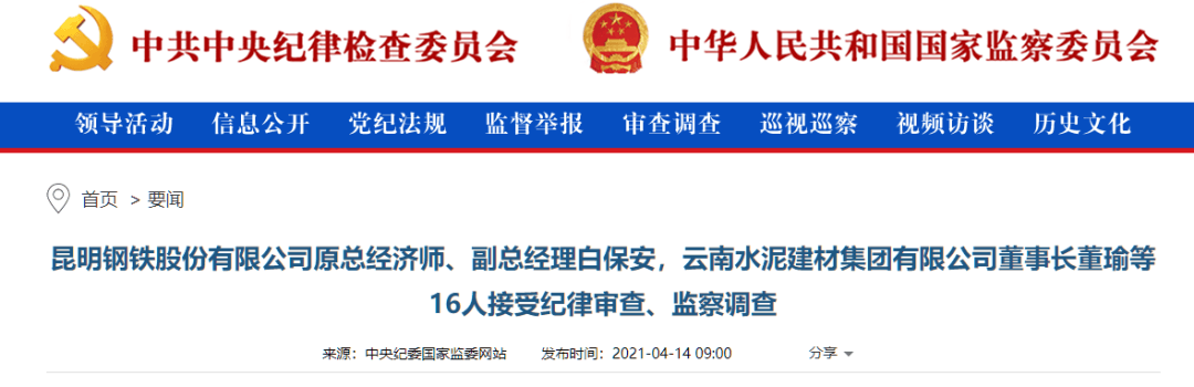 4月14日中央紀(jì)委國家監(jiān)委網(wǎng)站發(fā)布要聞消息:昆鋼黨委書記、董事長、云南水泥建材集團有限公司董事長董瑜等多人接受審查調(diào)查。詳情如下: