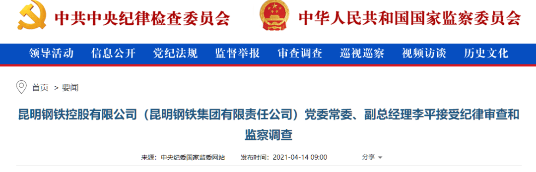 中央紀(jì)委國家監(jiān)委網(wǎng)站訊 據(jù)云南省紀(jì)委監(jiān)委消息:昆明鋼鐵控股有限公司(昆明鋼鐵集團有限責(zé)任公司)黨委常委、副總經(jīng)理李平涉嫌嚴(yán)重違紀(jì)違法,已主動投案,目前正在接受紀(jì)律審查和監(jiān)察調(diào)查。