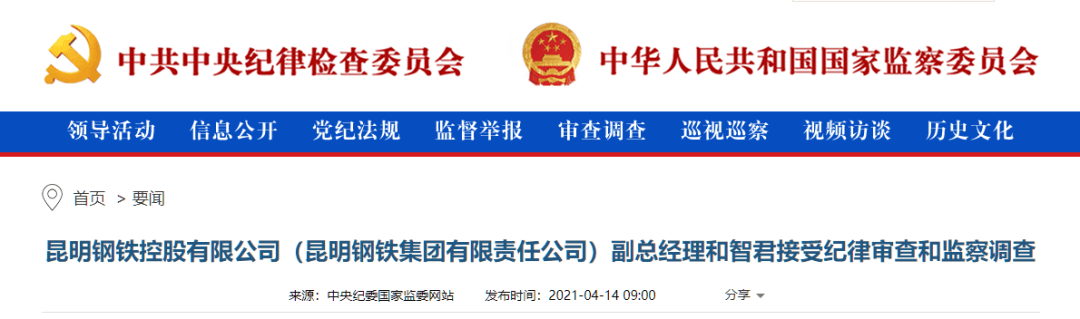 中央紀(jì)委國家監(jiān)委網(wǎng)站訊 據(jù)云南省紀(jì)委監(jiān)委消息:昆明鋼鐵控股有限公司(昆明鋼鐵集團有限責(zé)任公司)副總經(jīng)理和智君涉嫌嚴(yán)重違紀(jì)違法,已主動投案,目前正在接受紀(jì)律審查和監(jiān)察調(diào)查。