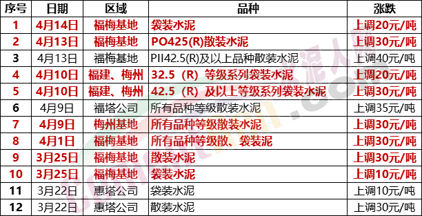 華南區(qū)域梅州市塔牌營銷有限公司分別于3月22日、25日以及4月1日、9日、10日、13日、14日連發(fā)6份漲價通知,其中梅州基地散裝水泥累計上調(diào)達120元/噸以上,福梅基地袋裝水泥累計上調(diào)80-90元/噸。