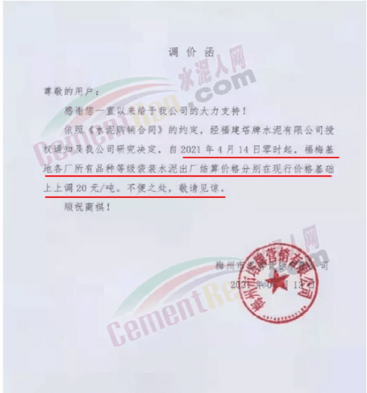 根據(jù)當前市場行情,我公司于2021年3月26日8:00時,對M32.5級袋裝水泥上調(diào)20元/噸,對PO42.5級袋裝水泥價格上調(diào)30元/噸,特此通知!