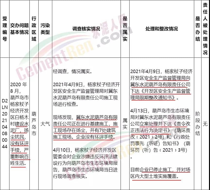日前,遼寧省生態(tài)環(huán)境廳公布《中央第二生態(tài)環(huán)境保護督察組群眾信訪舉報轉辦和邊督邊改公開情況一覽表(第3批 2021年4月18日)》提到一起階段性辦結信訪,涉及冀東水泥葫蘆島有限責任公司。