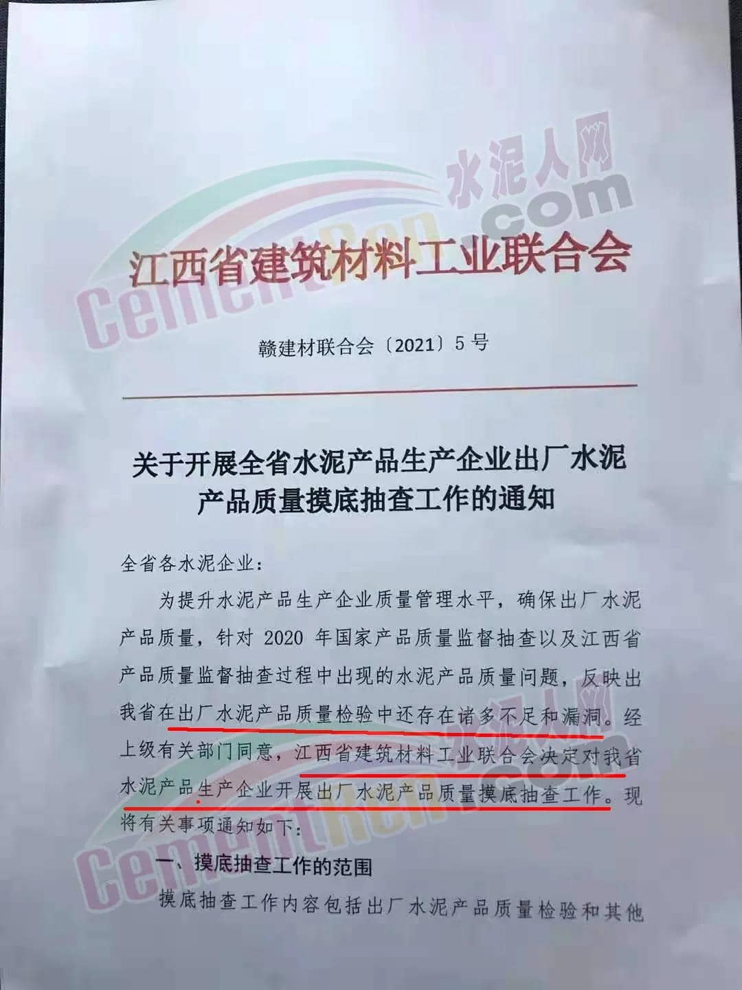日前,江西省建筑材料工業(yè)聯(lián)合會發(fā)布《關(guān)于開展全省水泥產(chǎn)品生產(chǎn)企業(yè)出廠水泥產(chǎn)品質(zhì)量摸底抽查工作的通知》給全省各水泥企業(yè)稱,為提升水泥產(chǎn)品生產(chǎn)企業(yè)質(zhì)量管理水平,確保出廠水泥產(chǎn)品質(zhì)量,針對 2020 年國家產(chǎn)品質(zhì)量監(jiān)督抽查以及江西省產(chǎn)品質(zhì)量監(jiān)督抽查過程中出現(xiàn)的水泥產(chǎn)品質(zhì)量問題,反映出江西省在出廠水泥產(chǎn)品質(zhì)量檢驗中還存在諸多不足和漏洞。經(jīng)上級有關(guān)部門同意,江西省建筑材料工業(yè)聯(lián)合會決定對全省水泥產(chǎn)品生產(chǎn)企業(yè)開展出廠水泥產(chǎn)品質(zhì)量摸底抽查工作。