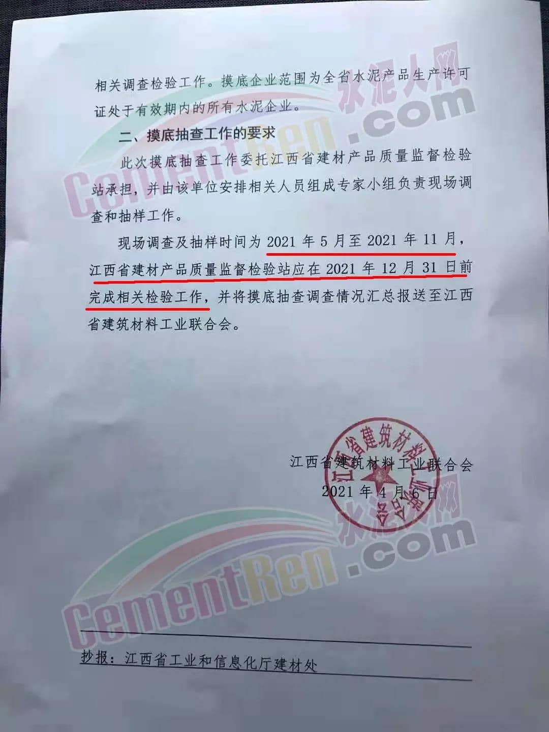 此次摸底抽查工作委托江西省建材產(chǎn)品 質(zhì)量監(jiān)督檢驗站承擔(dān),并由該單位安排相關(guān)人員組成專家小組負(fù)責(zé)現(xiàn)場調(diào)查和抽樣工作。現(xiàn)場調(diào)查及抽樣時間為2021年 5 月至 2021 年 11 月,江西省建材產(chǎn)品質(zhì)量監(jiān)督檢驗站應(yīng)在 12 月 31 日前完成相關(guān)檢驗工作,并將摸底抽查調(diào)查情況匯總報送至江西省建筑材料工業(yè)聯(lián)合會。