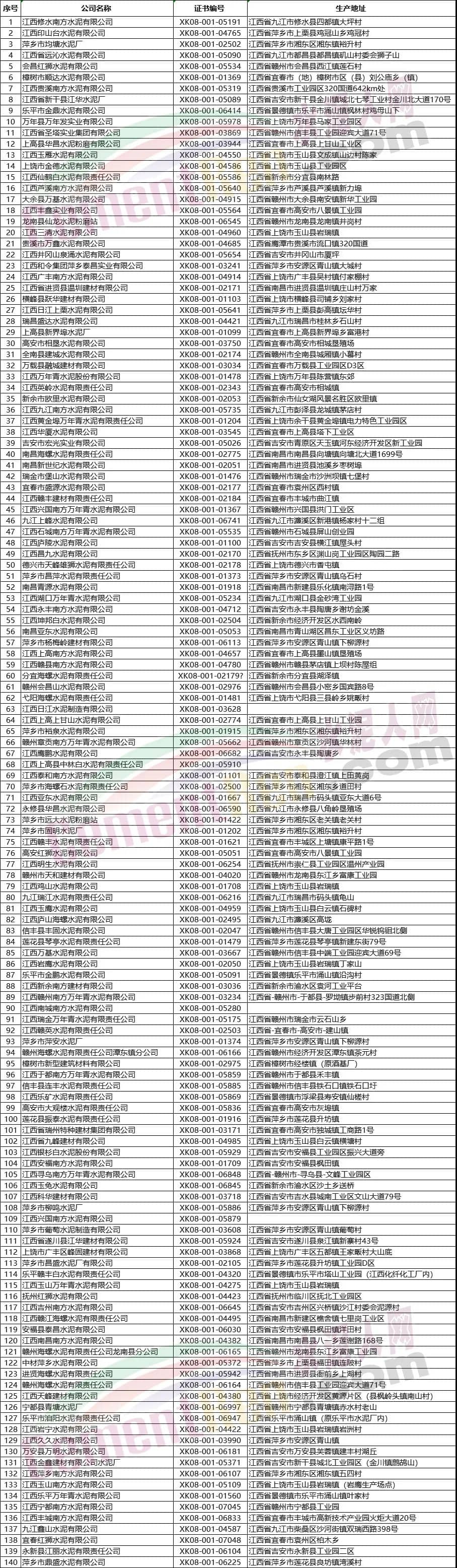 江西省水泥企業(yè)名單