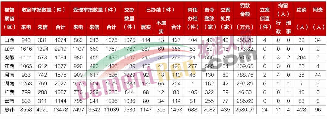 日前,水泥人網(wǎng)從生態(tài)環(huán)境部獲悉,第二輪第三批中央生態(tài)環(huán)境保護(hù)督察進(jìn)入下沉工作階段。截至4月19日晚20:00,各督察組共收到群眾來電、來信舉報(bào)13478件,受理有效舉報(bào)11039件,經(jīng)梳理合并重復(fù)舉報(bào),累計(jì)向被督察單位轉(zhuǎn)辦9630件。據(jù)了解,上述舉報(bào)中涉及海螺水泥、華新水泥、紅獅水泥、冀東水泥、同力水泥、萬年青水泥等多家水泥企業(yè)。
