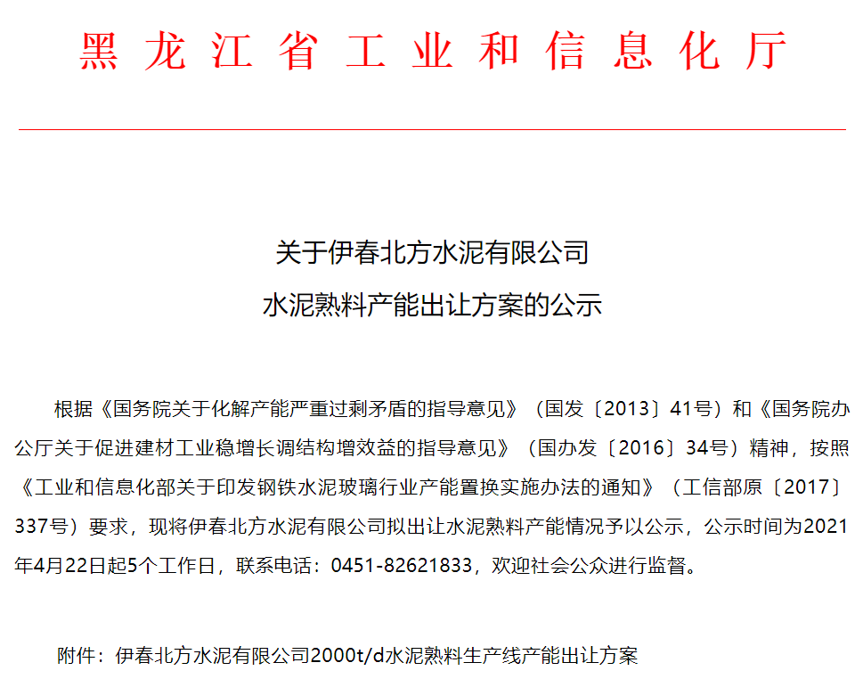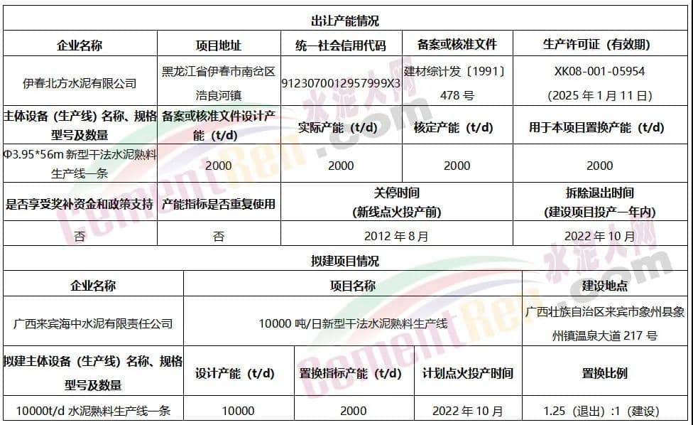 日前,黑龍江工信廳發(fā)布《關(guān)于伊春北方水泥有限公司 2000t/d水泥熟料生產(chǎn)線產(chǎn)能出讓方案的公示》公示內(nèi)容顯示,伊春北方水泥有限公司退出位于黑龍江省伊春市南岔區(qū)浩良河鎮(zhèn)的一條2000t/d新型干法水泥熟料生產(chǎn)線,用于在廣西壯族自治區(qū)來賓市象州縣新建一條10000t/d新型干法水泥熟料生產(chǎn)線。新線計(jì)劃點(diǎn)火投產(chǎn)時間為2022年10月,置換比例為1.25(退出):1(建設(shè)),受讓企業(yè)為廣西來賓海中水泥有限責(zé)任公司。