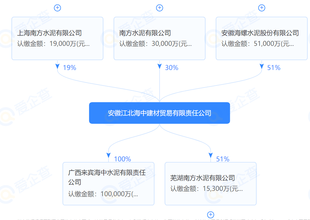 其股東信息顯示,發(fā)起股東為安徽江北海中建材貿(mào)易有限責(zé)任公司。股權(quán)穿透圖顯示,安徽江北海中建材貿(mào)易有限責(zé)任公司股東為上海南方水泥、南方水泥和安徽海螺水泥合資公司三家企業(yè)。