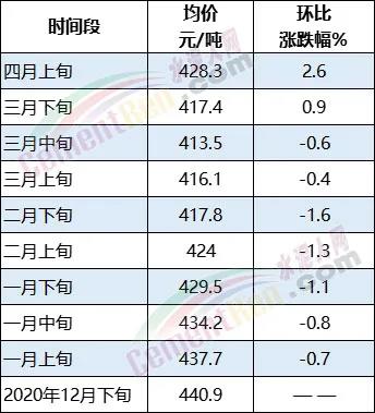 以PO42.5散裝水泥為例,國家統(tǒng)計(jì)局?jǐn)?shù)據(jù)顯示:2020年末PO42.5散裝水泥均價(jià)為440.9元/噸,一月上旬出現(xiàn)小幅下跌至437.7元/噸,四月上旬均價(jià)為428.3元/噸,四月上旬環(huán)比一月上旬報(bào)價(jià)降幅為2.15%。三月下旬到四月上旬漲幅為2.6%。