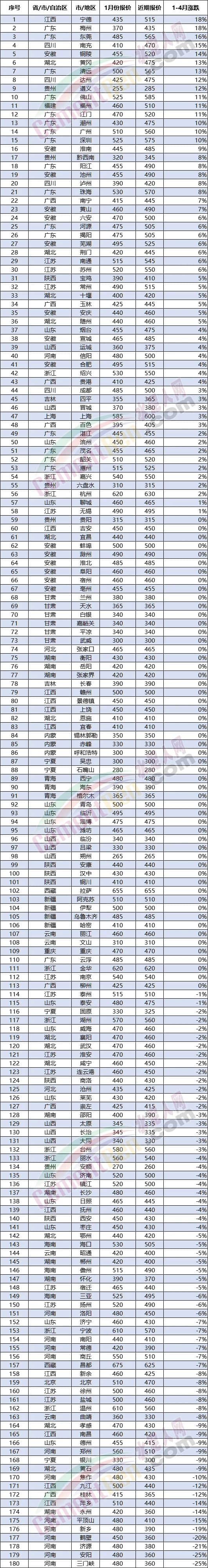 從水泥人網(wǎng)信息中心監(jiān)控?cái)?shù)據(jù)可見,三十一個省市自治區(qū)年初至今絕大多數(shù)區(qū)域水泥價(jià)格處于下跌或持平,180個區(qū)域中有58個地區(qū)有1%~18%的漲幅,漲幅18%的區(qū)域?yàn)榻鲗幍潞蛷V東梅州地區(qū)。67個區(qū)域下跌1%~25%,下跌25%的為河南三門峽和安陽地區(qū)。綜合來看,有將近70%的區(qū)域水泥價(jià)格出現(xiàn)波動,30%的區(qū)域水泥價(jià)格與1月份報(bào)價(jià)持平。價(jià)格波動的區(qū)域中有一半以上的企業(yè)目前報(bào)價(jià)較1月份下跌。