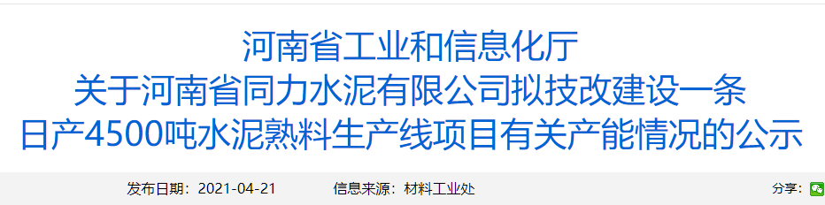 日前,河南省工業(yè)和信息化廳發(fā)布《關(guān)于河南省同力水泥有限公司擬技改建設(shè)一條日產(chǎn)4500噸水泥熟料生產(chǎn)線項目有關(guān)產(chǎn)能情況的公示》稱,河南省同力水泥有限公司擬通過通過“拆二合一”建設(shè)一條日產(chǎn)4500噸水泥熟料生產(chǎn)線。