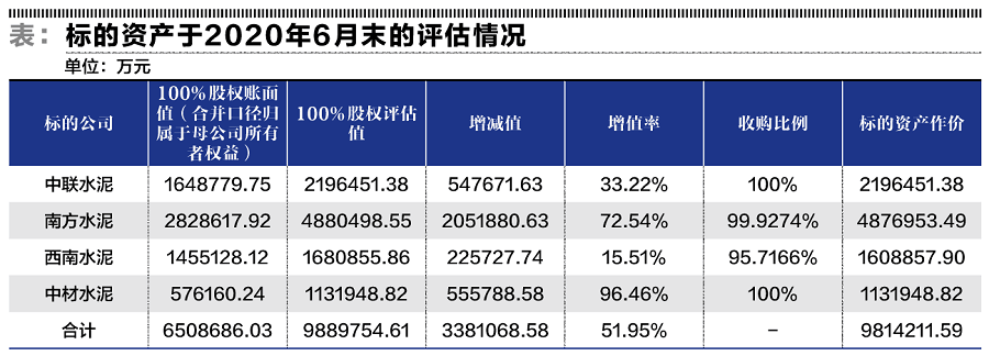而中聯(lián)水泥等四家公司的估值取決于經(jīng)國資委備案的沃克森國際資產(chǎn)評估公司出具的第三方資產(chǎn)評估報告。以2020年6月30日為基準(zhǔn)日,沃克森采納的對標(biāo)公司包括海螺水泥、天山股份、祁連山和上峰水泥等可比企業(yè),以6.03-7.84倍市盈率取值作為基礎(chǔ),經(jīng)25%不可流通折扣率等調(diào)整后,運(yùn)用市場法得出的最終評估結(jié)果是:中聯(lián)水泥的股權(quán)價值為219.6億元、南方水泥的股權(quán)估值為488億元、西南水泥的股權(quán)估值為168.1億元、中材水泥的股權(quán)益估值為113.2億元。