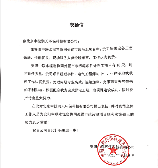 作為項目之本,履約質(zhì)量、工期質(zhì)量、服務(wù)保障質(zhì)量發(fā)展已成為潤天環(huán)保新的金字招牌。近日,南方水泥、中聯(lián)水泥、杰夏環(huán)保、新奧環(huán)保、礦峰集團等多家單位向潤天環(huán)保致函、致電,對于潤天項目的整體水準,以及現(xiàn)場項目經(jīng)理團隊的敬業(yè)精神與專業(yè)水平,均提出了高度贊揚。