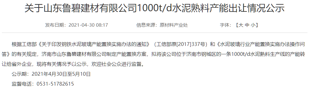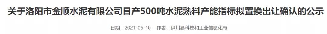日前,河南省洛陽(yáng)市伊川縣人民政府發(fā)布《關(guān)于洛陽(yáng)市金順?biāo)嘤邢薰救债a(chǎn)500噸水泥熟料產(chǎn)能指標(biāo)擬置換出讓確認(rèn)的公示》稱,根據(jù)相關(guān)文件規(guī)定,現(xiàn)將關(guān)閉出讓的確認(rèn)產(chǎn)能有關(guān)情況進(jìn)行公示,具體公示如下: