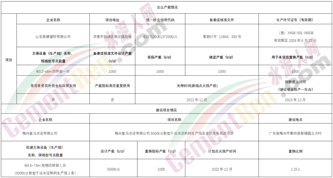 據(jù)水泥人網(wǎng)此前報(bào)道,山東省濟(jì)南市山東魯碧建材有限公司擬將該公司位于濟(jì)南市鋼城區(qū)的一條1000t/d水泥熟料生產(chǎn)線的產(chǎn)能轉(zhuǎn)讓給省外企業(yè)梅州皇馬水泥有限公司。用于在廣東省梅州市蕉嶺縣新鋪鎮(zhèn)北方村新建一條5000t/d新型干法水泥熟料生產(chǎn)線。 新建生產(chǎn)線或?qū)⒂?022年12月點(diǎn)火投產(chǎn)。