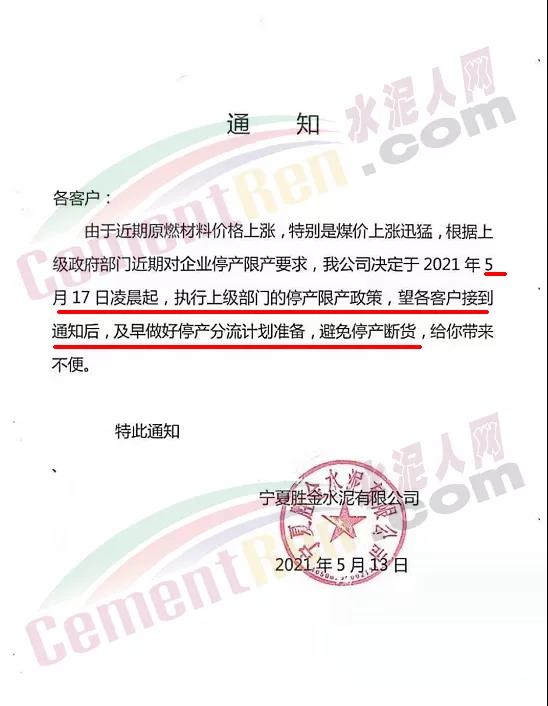水泥人網(wǎng)通訊員消息:5月13日,寧夏勝金水泥有限公司通知,由于近期原燃材料價格上漲,特別是煤價上漲迅猛,根據(jù)上級政府部門近期對企業(yè)停產(chǎn)限產(chǎn)要求,公司決定于2021年5月17日凌晨起,執(zhí)行上級部門的停產(chǎn)限產(chǎn)政策,望各客戶接到通知后,及早做好停產(chǎn)分流計劃準備,避免停產(chǎn)斷貨。