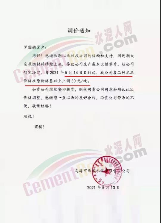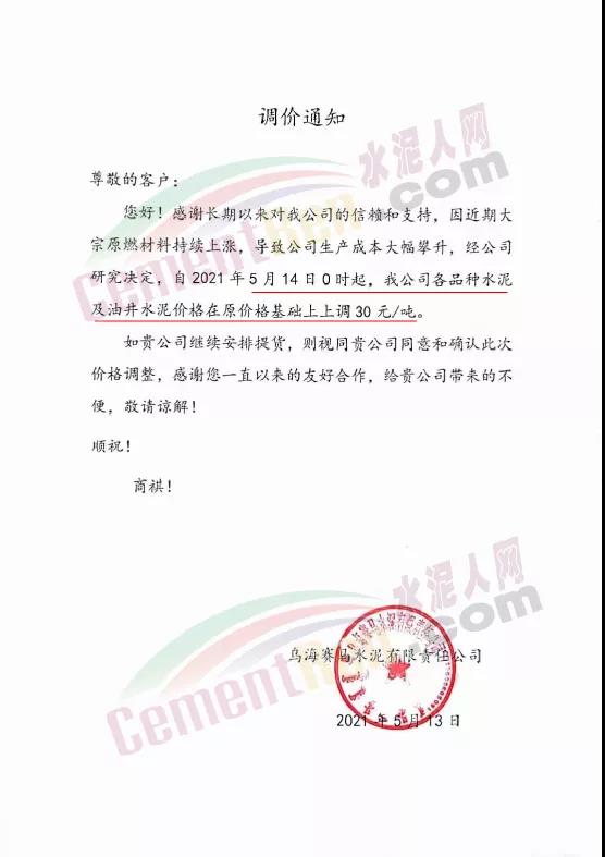 同日,烏海賽馬有限責任公司通知,因近期大宗原燃材料持續(xù)上漲,導致公司生產(chǎn)成本大幅攀升,經(jīng)公司研究決定,自2021年5月14日0時起,各品種水泥及油井水泥價格在原價格基礎上上調30元/噸。