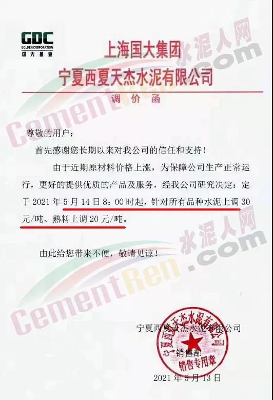 寧夏西夏天杰水泥有限公司通知,由于近期原材料價格上漲,為保障公司生產(chǎn)正常運行,更好的提供優(yōu)質的產(chǎn)品及服務。經(jīng)公司研究決定,于2021年5月14日8∶00時起,針對所有品種水泥上調30元/噸、熟料上調20元/噸。