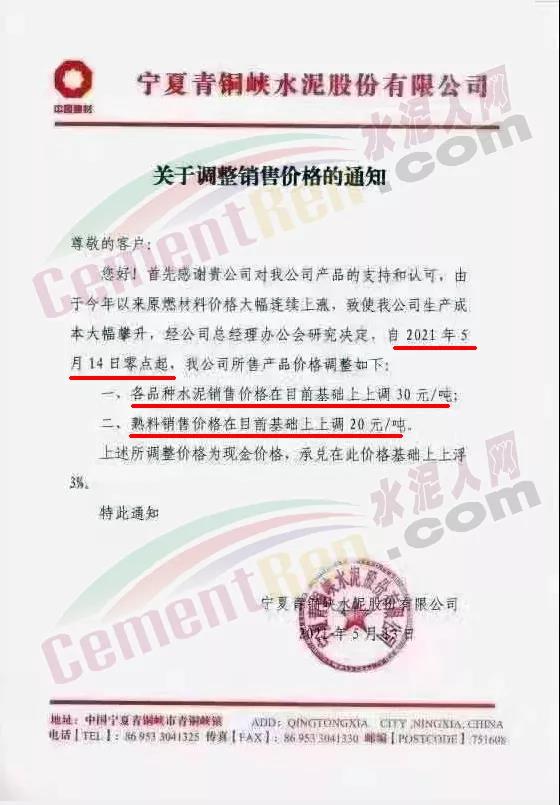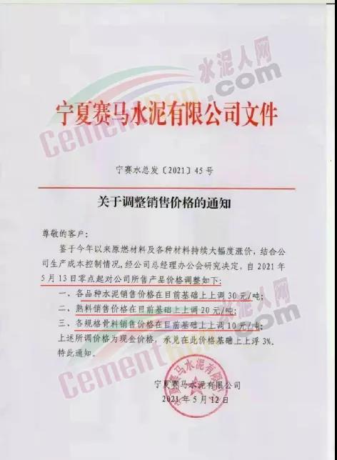 寧夏賽馬水泥通知,鑒于今年以來原燃材料及各種材料持續(xù)大幅度漲價,結合公司生產(chǎn)成本控制情況,經(jīng)公司總經(jīng)理辦公會研究決定,自2021年5月13日零點起對公司所售各品種水泥上調30元/噸,熟料上調20元/噸,各規(guī)格骨料銷售價格上調10元/噸。上述所調價格為現(xiàn)金價格,承兌在此價格基礎上上浮3%。