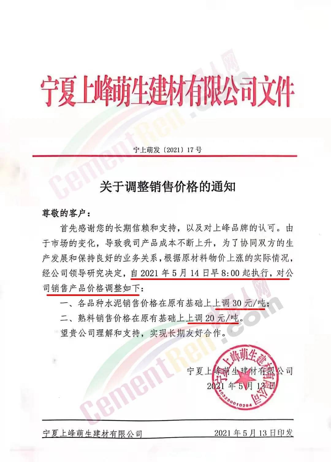 寧夏上峰萌生建材有限公司通知由于市場的變化,導致公司產(chǎn)品成本不斷上升,為了協(xié)同雙方的生產(chǎn)發(fā)展和保持良好的業(yè)務關系,根據(jù)原材料物價上漲的實際情況,經(jīng)公司領導研究決定,自2021年5月14 日早8∶00 起執(zhí)行,對公司各品種水泥銷售價格在原有基礎上上調 30 元/噸;熟料銷售價格在原有基礎上上調 20 元/噸。