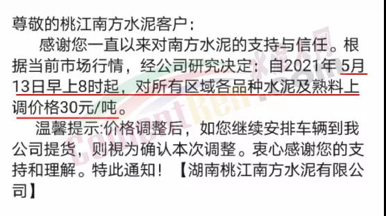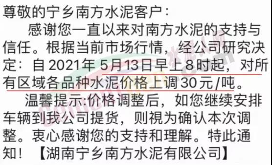 湖南桃江南方水泥通知,根據(jù)當前市場行情,經(jīng)公司研究決定∶自2021年5月13日早上8時起,對所有區(qū)域各品種水泥及熟料上調價格30元/噸。