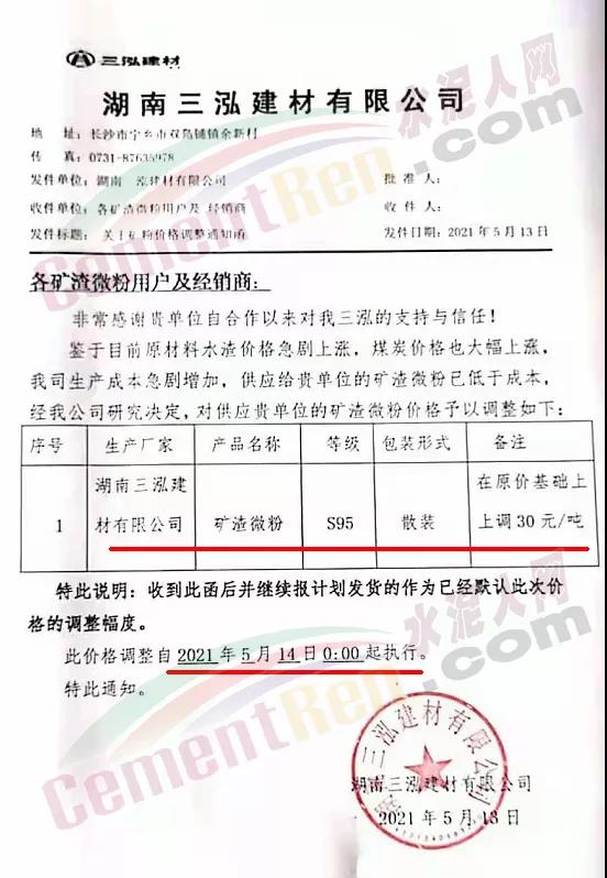 同期,湖南多家礦粉企業(yè)通知上調礦粉價格。湖南三泓建材有限公司通知稱因原材料價格不斷上漲,成本急劇增加,經(jīng)公司研究決定,從2021年5月14日開始,對所有區(qū)域礦粉價格在原來基礎上上調30元/噸。