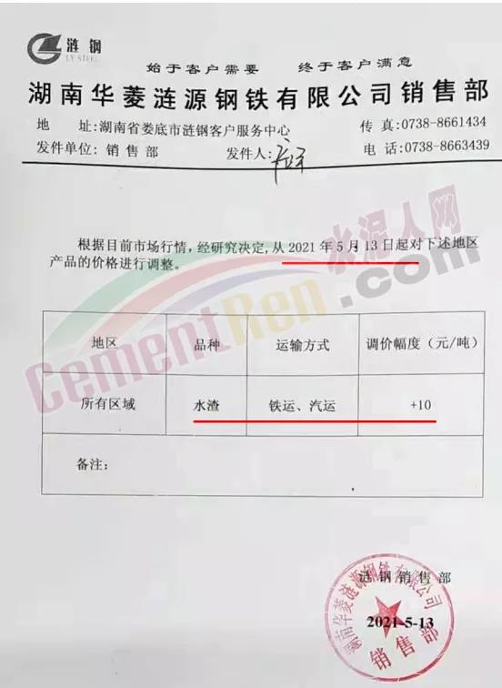 湖南華菱漣源鋼鐵有限公司銷售部通知,根據(jù)目前市場行情,經(jīng)研究決定,從5月13日起對所有區(qū)域鐵運、汽運水渣品種上調10元/噸。