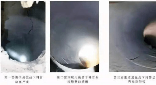 2020年10月份水泥窯檢修時發(fā)現整體微晶下料管內沒有任何結皮,下料管的接口條紋清新可見,工程技術人員對此狀況驚嘆不已,當場決定不做任何修正繼續(xù)使用。又經過第二窯期的運行至今年四月底,再次停窯后發(fā)現下料管仍完好如初,于是順利投入了第三個窯期的運行。