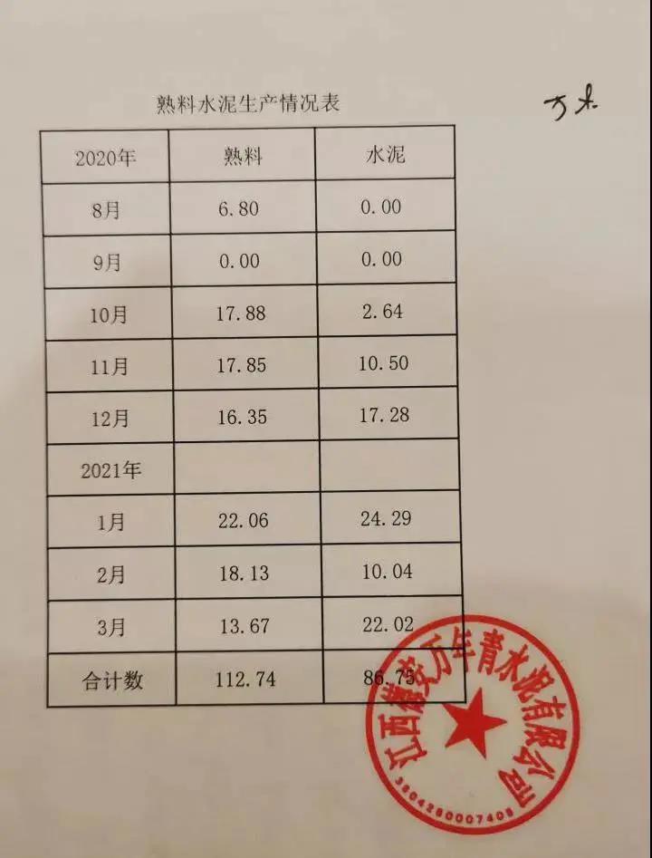 圖2 德安萬(wàn)年青水泥有限公司熟料生產(chǎn)臺(tái)賬。截至今年3月底,已累計(jì)生產(chǎn)水泥熟料112.74萬(wàn)噸
