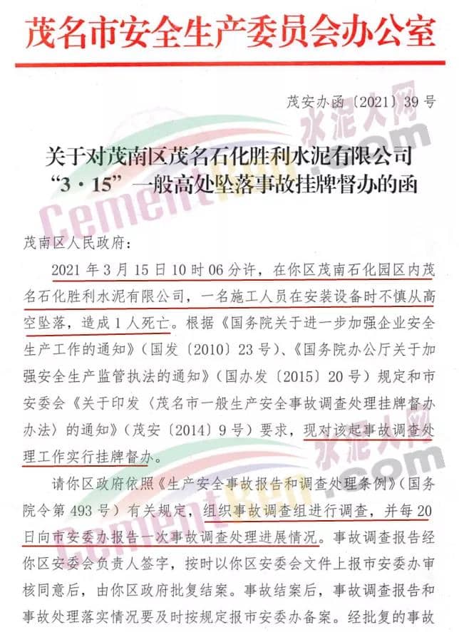 日前,廣東省茂名市茂南區(qū)人民政府發(fā)布《關(guān)于對(duì)茂南區(qū)茂名石化勝利水泥有限公司“3·15”一般高處墜落事故掛牌督辦的函》稱,根據(jù)相關(guān)通知要求,對(duì)茂南區(qū)茂名石化勝利水泥有限公司“3·15”一般高處墜落事故調(diào)查處理工作實(shí)行掛牌督辦。具體通知如下: