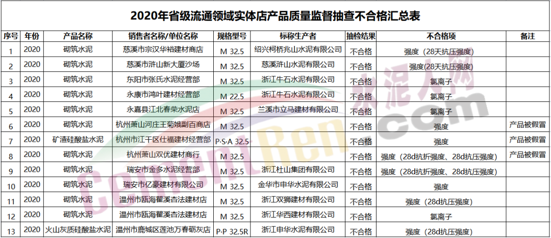 日前,浙江省市場監(jiān)管局發(fā)布《關(guān)于2020年流通領(lǐng)域?qū)嶓w店產(chǎn)品質(zhì)量監(jiān)督抽查情況的通報(bào)》稱,浙江省市場監(jiān)管局對2020年以來流通領(lǐng)域?qū)嶓w店銷售的水泥等14種重點(diǎn)消費(fèi)品開展了產(chǎn)品質(zhì)量監(jiān)督抽查,其中抽查的40批次水泥產(chǎn)品中有13批次產(chǎn)品不合格,不合格發(fā)現(xiàn)率為32.50%。具體抽查情況通報(bào)如下: