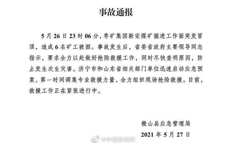記者從山東省委宣傳部獲悉,5月26日23時(shí)06分,棗礦集團(tuán)新安煤礦突發(fā)冒頂事故,造成6名礦工被困。濟(jì)寧市和山東省相關(guān)部門單位迅速啟動(dòng)應(yīng)急預(yù)案,第一時(shí)間調(diào)集專業(yè)救援力量,全力組織現(xiàn)場(chǎng)搶險(xiǎn)救援。